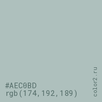 Цвет #AEC0BD в цветовой модели RGB обозначается тремя октетами (174, 192, 189) в десятичном формате и #AEC0BD в шестнадцатиричном (hex) формате, которые являются интенсивностью красного 174 (hex AE), интенсивность зелёного 192 (hex C0) и интенсивность синего 189 (hex BD).