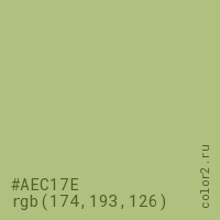 Цвет #AEC17E в цветовой модели RGB обозначается тремя октетами (174, 193, 126) в десятичном формате и #AEC17E в шестнадцатиричном (hex) формате, которые являются интенсивностью красного 174 (hex AE), интенсивность зелёного 193 (hex C1) и интенсивность синего 126 (hex 7E).