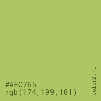 Цвет #AEC765 в цветовой модели RGB обозначается тремя октетами (174, 199, 101) в десятичном формате и #AEC765 в шестнадцатиричном (hex) формате, которые являются интенсивностью красного 174 (hex AE), интенсивность зелёного 199 (hex C7) и интенсивность синего 101 (hex 65).