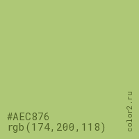 Цвет #AEC876 в цветовой модели RGB обозначается тремя октетами (174, 200, 118) в десятичном формате и #AEC876 в шестнадцатиричном (hex) формате, которые являются интенсивностью красного 174 (hex AE), интенсивность зелёного 200 (hex C8) и интенсивность синего 118 (hex 76).