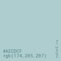 Цвет #AECDCF в цветовой модели RGB обозначается тремя октетами (174, 205, 207) в десятичном формате и #AECDCF в шестнадцатиричном (hex) формате, которые являются интенсивностью красного 174 (hex AE), интенсивность зелёного 205 (hex CD) и интенсивность синего 207 (hex CF).