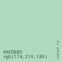 Цвет #AEDBBD в цветовой модели RGB обозначается тремя октетами (174, 219, 189) в десятичном формате и #AEDBBD в шестнадцатиричном (hex) формате, которые являются интенсивностью красного 174 (hex AE), интенсивность зелёного 219 (hex DB) и интенсивность синего 189 (hex BD).