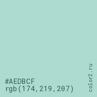 Цвет #AEDBCF в цветовой модели RGB обозначается тремя октетами (174, 219, 207) в десятичном формате и #AEDBCF в шестнадцатиричном (hex) формате, которые являются интенсивностью красного 174 (hex AE), интенсивность зелёного 219 (hex DB) и интенсивность синего 207 (hex CF).
