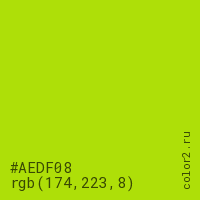 Цвет #AEDF08 в цветовой модели RGB обозначается тремя октетами (174, 223, 8) в десятичном формате и #AEDF08 в шестнадцатиричном (hex) формате, которые являются интенсивностью красного 174 (hex AE), интенсивность зелёного 223 (hex DF) и интенсивность синего 8 (hex 08).
