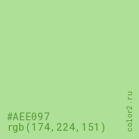 Цвет #AEE097 в цветовой модели RGB обозначается тремя октетами (174, 224, 151) в десятичном формате и #AEE097 в шестнадцатиричном (hex) формате, которые являются интенсивностью красного 174 (hex AE), интенсивность зелёного 224 (hex E0) и интенсивность синего 151 (hex 97).
