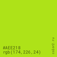 Цвет #AEE218 в цветовой модели RGB обозначается тремя октетами (174, 226, 24) в десятичном формате и #AEE218 в шестнадцатиричном (hex) формате, которые являются интенсивностью красного 174 (hex AE), интенсивность зелёного 226 (hex E2) и интенсивность синего 24 (hex 18).