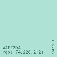 Цвет #AEE2D4 в цветовой модели RGB обозначается тремя октетами (174, 226, 212) в десятичном формате и #AEE2D4 в шестнадцатиричном (hex) формате, которые являются интенсивностью красного 174 (hex AE), интенсивность зелёного 226 (hex E2) и интенсивность синего 212 (hex D4).