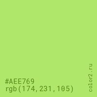 Цвет #AEE769 в цветовой модели RGB обозначается тремя октетами (174, 231, 105) в десятичном формате и #AEE769 в шестнадцатиричном (hex) формате, которые являются интенсивностью красного 174 (hex AE), интенсивность зелёного 231 (hex E7) и интенсивность синего 105 (hex 69).