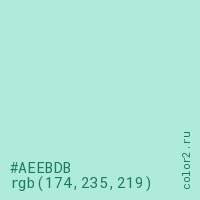 Цвет #AEEBDB в цветовой модели RGB обозначается тремя октетами (174, 235, 219) в десятичном формате и #AEEBDB в шестнадцатиричном (hex) формате, которые являются интенсивностью красного 174 (hex AE), интенсивность зелёного 235 (hex EB) и интенсивность синего 219 (hex DB).