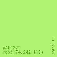 Цвет #AEF271 в цветовой модели RGB обозначается тремя октетами (174, 242, 113) в десятичном формате и #AEF271 в шестнадцатиричном (hex) формате, которые являются интенсивностью красного 174 (hex AE), интенсивность зелёного 242 (hex F2) и интенсивность синего 113 (hex 71).