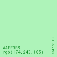 Цвет #AEF3B9 в цветовой модели RGB обозначается тремя октетами (174, 243, 185) в десятичном формате и #AEF3B9 в шестнадцатиричном (hex) формате, которые являются интенсивностью красного 174 (hex AE), интенсивность зелёного 243 (hex F3) и интенсивность синего 185 (hex B9).