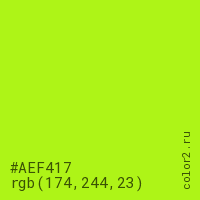 Цвет #AEF417 в цветовой модели RGB обозначается тремя октетами (174, 244, 23) в десятичном формате и #AEF417 в шестнадцатиричном (hex) формате, которые являются интенсивностью красного 174 (hex AE), интенсивность зелёного 244 (hex F4) и интенсивность синего 23 (hex 17).