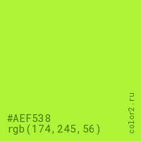 Цвет #AEF538 в цветовой модели RGB обозначается тремя октетами (174, 245, 56) в десятичном формате и #AEF538 в шестнадцатиричном (hex) формате, которые являются интенсивностью красного 174 (hex AE), интенсивность зелёного 245 (hex F5) и интенсивность синего 56 (hex 38).