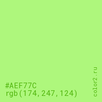 Цвет #AEF77C в цветовой модели RGB обозначается тремя октетами (174, 247, 124) в десятичном формате и #AEF77C в шестнадцатиричном (hex) формате, которые являются интенсивностью красного 174 (hex AE), интенсивность зелёного 247 (hex F7) и интенсивность синего 124 (hex 7C).