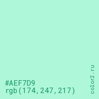 Цвет #AEF7D9 в цветовой модели RGB обозначается тремя октетами (174, 247, 217) в десятичном формате и #AEF7D9 в шестнадцатиричном (hex) формате, которые являются интенсивностью красного 174 (hex AE), интенсивность зелёного 247 (hex F7) и интенсивность синего 217 (hex D9).