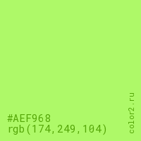 Цвет #AEF968 в цветовой модели RGB обозначается тремя октетами (174, 249, 104) в десятичном формате и #AEF968 в шестнадцатиричном (hex) формате, которые являются интенсивностью красного 174 (hex AE), интенсивность зелёного 249 (hex F9) и интенсивность синего 104 (hex 68).