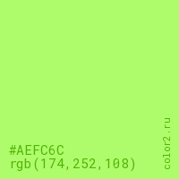 Цвет #AEFC6C в цветовой модели RGB обозначается тремя октетами (174, 252, 108) в десятичном формате и #AEFC6C в шестнадцатиричном (hex) формате, которые являются интенсивностью красного 174 (hex AE), интенсивность зелёного 252 (hex FC) и интенсивность синего 108 (hex 6C).