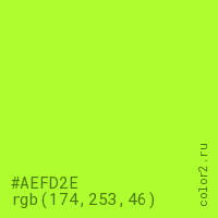 Цвет #AEFD2E в цветовой модели RGB обозначается тремя октетами (174, 253, 46) в десятичном формате и #AEFD2E в шестнадцатиричном (hex) формате, которые являются интенсивностью красного 174 (hex AE), интенсивность зелёного 253 (hex FD) и интенсивность синего 46 (hex 2E).