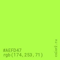 Цвет #AEFD47 в цветовой модели RGB обозначается тремя октетами (174, 253, 71) в десятичном формате и #AEFD47 в шестнадцатиричном (hex) формате, которые являются интенсивностью красного 174 (hex AE), интенсивность зелёного 253 (hex FD) и интенсивность синего 71 (hex 47).