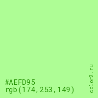 Цвет #AEFD95 в цветовой модели RGB обозначается тремя октетами (174, 253, 149) в десятичном формате и #AEFD95 в шестнадцатиричном (hex) формате, которые являются интенсивностью красного 174 (hex AE), интенсивность зелёного 253 (hex FD) и интенсивность синего 149 (hex 95).