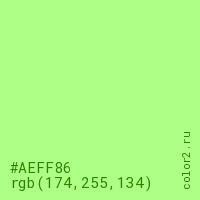 Цвет #AEFF86 в цветовой модели RGB обозначается тремя октетами (174, 255, 134) в десятичном формате и #AEFF86 в шестнадцатиричном (hex) формате, которые являются интенсивностью красного 174 (hex AE), интенсивность зелёного 255 (hex FF) и интенсивность синего 134 (hex 86).