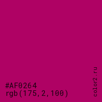 Цвет #AF0264 в цветовой модели RGB обозначается тремя октетами (175, 2, 100) в десятичном формате и #AF0264 в шестнадцатиричном (hex) формате, которые являются интенсивностью красного 175 (hex AF), интенсивность зелёного 2 (hex 02) и интенсивность синего 100 (hex 64).