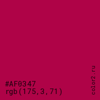 Цвет #AF0347 в цветовой модели RGB обозначается тремя октетами (175, 3, 71) в десятичном формате и #AF0347 в шестнадцатиричном (hex) формате, которые являются интенсивностью красного 175 (hex AF), интенсивность зелёного 3 (hex 03) и интенсивность синего 71 (hex 47).