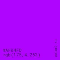 Цвет #AF04FD в цветовой модели RGB обозначается тремя октетами (175, 4, 253) в десятичном формате и #AF04FD в шестнадцатиричном (hex) формате, которые являются интенсивностью красного 175 (hex AF), интенсивность зелёного 4 (hex 04) и интенсивность синего 253 (hex FD).