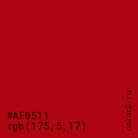 Цвет #AF0511 в цветовой модели RGB обозначается тремя октетами (175, 5, 17) в десятичном формате и #AF0511 в шестнадцатиричном (hex) формате, которые являются интенсивностью красного 175 (hex AF), интенсивность зелёного 5 (hex 05) и интенсивность синего 17 (hex 11).