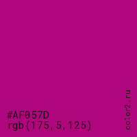 Цвет #AF057D в цветовой модели RGB обозначается тремя октетами (175, 5, 125) в десятичном формате и #AF057D в шестнадцатиричном (hex) формате, которые являются интенсивностью красного 175 (hex AF), интенсивность зелёного 5 (hex 05) и интенсивность синего 125 (hex 7D).