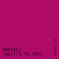 Цвет #AF0A67 в цветовой модели RGB обозначается тремя октетами (175, 10, 103) в десятичном формате и #AF0A67 в шестнадцатиричном (hex) формате, которые являются интенсивностью красного 175 (hex AF), интенсивность зелёного 10 (hex 0A) и интенсивность синего 103 (hex 67).