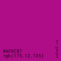 Цвет #AF0C87 в цветовой модели RGB обозначается тремя октетами (175, 12, 135) в десятичном формате и #AF0C87 в шестнадцатиричном (hex) формате, которые являются интенсивностью красного 175 (hex AF), интенсивность зелёного 12 (hex 0C) и интенсивность синего 135 (hex 87).