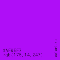 Цвет #AF0EF7 в цветовой модели RGB обозначается тремя октетами (175, 14, 247) в десятичном формате и #AF0EF7 в шестнадцатиричном (hex) формате, которые являются интенсивностью красного 175 (hex AF), интенсивность зелёного 14 (hex 0E) и интенсивность синего 247 (hex F7).