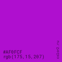 Цвет #AF0FCF в цветовой модели RGB обозначается тремя октетами (175, 15, 207) в десятичном формате и #AF0FCF в шестнадцатиричном (hex) формате, которые являются интенсивностью красного 175 (hex AF), интенсивность зелёного 15 (hex 0F) и интенсивность синего 207 (hex CF).