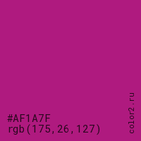 Цвет #AF1A7F в цветовой модели RGB обозначается тремя октетами (175, 26, 127) в десятичном формате и #AF1A7F в шестнадцатиричном (hex) формате, которые являются интенсивностью красного 175 (hex AF), интенсивность зелёного 26 (hex 1A) и интенсивность синего 127 (hex 7F).
