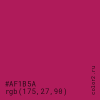 Цвет #AF1B5A в цветовой модели RGB обозначается тремя октетами (175, 27, 90) в десятичном формате и #AF1B5A в шестнадцатиричном (hex) формате, которые являются интенсивностью красного 175 (hex AF), интенсивность зелёного 27 (hex 1B) и интенсивность синего 90 (hex 5A).