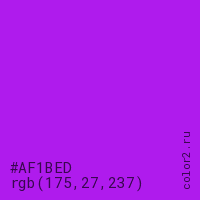 Цвет #AF1BED в цветовой модели RGB обозначается тремя октетами (175, 27, 237) в десятичном формате и #AF1BED в шестнадцатиричном (hex) формате, которые являются интенсивностью красного 175 (hex AF), интенсивность зелёного 27 (hex 1B) и интенсивность синего 237 (hex ED).