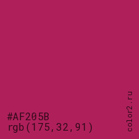Цвет #AF205B в цветовой модели RGB обозначается тремя октетами (175, 32, 91) в десятичном формате и #AF205B в шестнадцатиричном (hex) формате, которые являются интенсивностью красного 175 (hex AF), интенсивность зелёного 32 (hex 20) и интенсивность синего 91 (hex 5B).