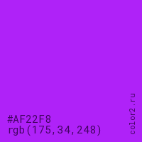 Цвет #AF22F8 в цветовой модели RGB обозначается тремя октетами (175, 34, 248) в десятичном формате и #AF22F8 в шестнадцатиричном (hex) формате, которые являются интенсивностью красного 175 (hex AF), интенсивность зелёного 34 (hex 22) и интенсивность синего 248 (hex F8).