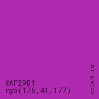 Цвет #AF29B1 в цветовой модели RGB обозначается тремя октетами (175, 41, 177) в десятичном формате и #AF29B1 в шестнадцатиричном (hex) формате, которые являются интенсивностью красного 175 (hex AF), интенсивность зелёного 41 (hex 29) и интенсивность синего 177 (hex B1).