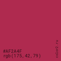 Цвет #AF2A4F в цветовой модели RGB обозначается тремя октетами (175, 42, 79) в десятичном формате и #AF2A4F в шестнадцатиричном (hex) формате, которые являются интенсивностью красного 175 (hex AF), интенсивность зелёного 42 (hex 2A) и интенсивность синего 79 (hex 4F).