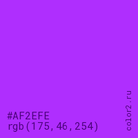 Цвет #AF2EFE в цветовой модели RGB обозначается тремя октетами (175, 46, 254) в десятичном формате и #AF2EFE в шестнадцатиричном (hex) формате, которые являются интенсивностью красного 175 (hex AF), интенсивность зелёного 46 (hex 2E) и интенсивность синего 254 (hex FE).