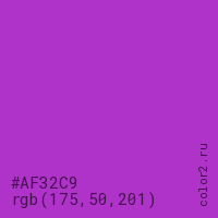 Цвет #AF32C9 в цветовой модели RGB обозначается тремя октетами (175, 50, 201) в десятичном формате и #AF32C9 в шестнадцатиричном (hex) формате, которые являются интенсивностью красного 175 (hex AF), интенсивность зелёного 50 (hex 32) и интенсивность синего 201 (hex C9).