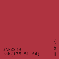 Цвет #AF3340 в цветовой модели RGB обозначается тремя октетами (175, 51, 64) в десятичном формате и #AF3340 в шестнадцатиричном (hex) формате, которые являются интенсивностью красного 175 (hex AF), интенсивность зелёного 51 (hex 33) и интенсивность синего 64 (hex 40).
