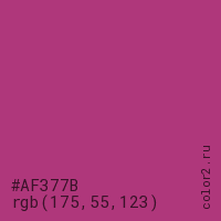 Цвет #AF377B в цветовой модели RGB обозначается тремя октетами (175, 55, 123) в десятичном формате и #AF377B в шестнадцатиричном (hex) формате, которые являются интенсивностью красного 175 (hex AF), интенсивность зелёного 55 (hex 37) и интенсивность синего 123 (hex 7B).