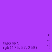 Цвет #AF39FA в цветовой модели RGB обозначается тремя октетами (175, 57, 250) в десятичном формате и #AF39FA в шестнадцатиричном (hex) формате, которые являются интенсивностью красного 175 (hex AF), интенсивность зелёного 57 (hex 39) и интенсивность синего 250 (hex FA).