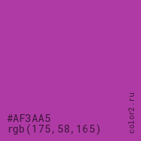 Цвет #AF3AA5 в цветовой модели RGB обозначается тремя октетами (175, 58, 165) в десятичном формате и #AF3AA5 в шестнадцатиричном (hex) формате, которые являются интенсивностью красного 175 (hex AF), интенсивность зелёного 58 (hex 3A) и интенсивность синего 165 (hex A5).