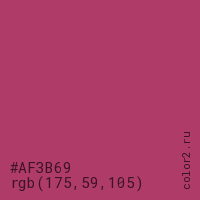 Цвет #AF3B69 в цветовой модели RGB обозначается тремя октетами (175, 59, 105) в десятичном формате и #AF3B69 в шестнадцатиричном (hex) формате, которые являются интенсивностью красного 175 (hex AF), интенсивность зелёного 59 (hex 3B) и интенсивность синего 105 (hex 69).