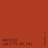 Цвет #AF3C22 в цветовой модели RGB обозначается тремя октетами (175, 60, 34) в десятичном формате и #AF3C22 в шестнадцатиричном (hex) формате, которые являются интенсивностью красного 175 (hex AF), интенсивность зелёного 60 (hex 3C) и интенсивность синего 34 (hex 22).