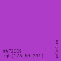 Цвет #AF3CC9 в цветовой модели RGB обозначается тремя октетами (175, 60, 201) в десятичном формате и #AF3CC9 в шестнадцатиричном (hex) формате, которые являются интенсивностью красного 175 (hex AF), интенсивность зелёного 60 (hex 3C) и интенсивность синего 201 (hex C9).